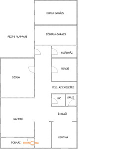 A ház elrendezése : Alsó szinten: Előszoba, nappali -étkező  konyha, kamra, külön wc és fürdőszoba amelyben tusoló és sarokkád is kapott helyet illetve a folyosó végén egy hálószoba és egy mosókonyha található.